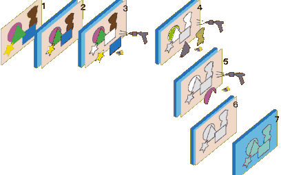 図柄の境界線を切り取りながら順にサンドブラストしてゆく方法。グラフィックソフトでマスクエリアを移動しながらペイントするのと似ています。たとえばバラの花の図柄では貼り付けたマスキングシートをバラの花弁一枚ずつを順番に切り取ってはサンドブラストを繰り返すことにより図柄の各オブジェクトの境界線が強調された立体的な表現ができます。