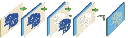 細密な図柄ではカッティングで抜くのは困難ですので専用のドライフィルムを写真製版の方法で図柄を抜いて素材に貼り付けます