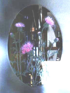まるでこの薊の花は鏡に写った本物のように見えますが、実はサンドブラストで段彫り彫刻したガラスに彩色したものなのです。ガラスの透明感を生かしたパステル調の淡い色ずかいやグラデーションにより、シックで落ち着いた色彩を作り出します。建築インテリアとしての彩色ガラスエッチングに私たちは期待しています。
